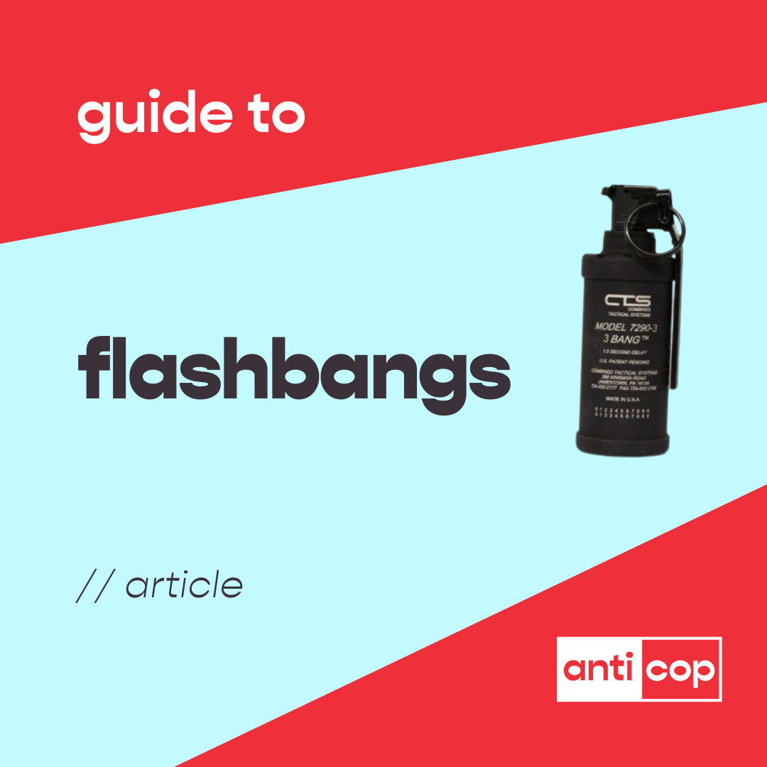 Flashbangs (also called stun grenades, or noise/flash diversionary devices) are single-use weapons thrown or fired into proximity of the victim, which then emit a deafening sound and flash of light. Police use flashbangs to overwhelm their victims’ senses, rendering them vulnerable to further attack.